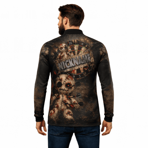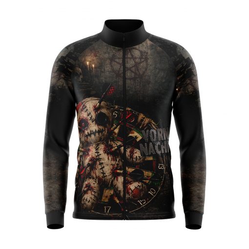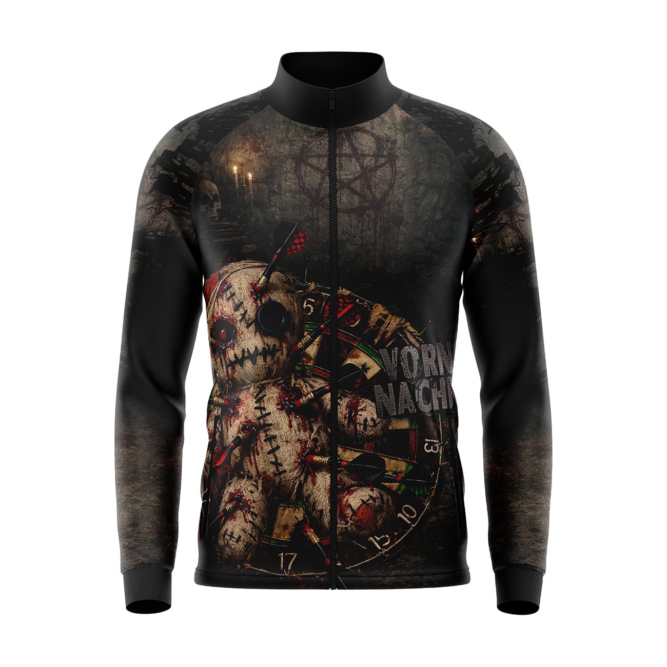 Die VODOO Dart Jacke verbindet ein düsteres Horror-Design mit sportlicher Performance, und genau dadurch entsteht eine Trainingsjacke, die Intensität und Entschlossenheit ausstrahlt. Während dunkle, erdige Farbtöne für eine geheimnisvolle Atmosphäre sorgen, verleihen Voodoo-Puppen, Kerzenlicht und mystische Symbole dem Design eine außergewöhnliche Tiefe. Dadurch wirkt die Jacke markant und provokant, bleibt jedoch gleichzeitig sportlich und professionell.