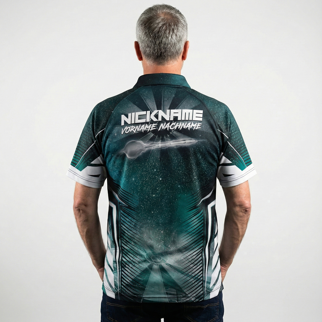 Das Astro Dart Trikot kann vollständig personalisiert werden – ob mit Nickname, Teamname oder beidem. Alternativ lassen sich die Felder leer lassen, um den cleanen, futuristischen Look vollständig wirken zu lassen.