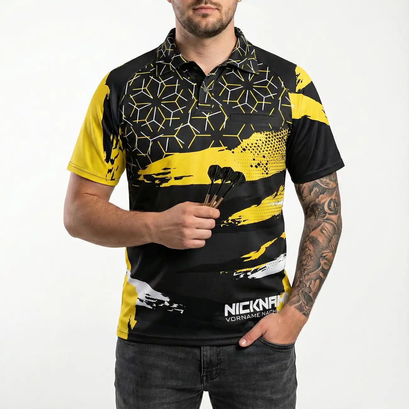 Professionelle Dartshirts in Premium-Qualität aus atmungsaktiven Polyesterstoff. Eine innenliegende Brusttasche ist für uns selbstverständlich. Diese ist bei unseren Dart Trikots feinsauber ausgearbeitet und bei uns grundsätzlich mit einem Reißverschluss versehen. Angenehmer Tragekomfort ist für uns selbstverständlich. Das Dart Trikot ist aus Hochleistungs-Polyester hergestellt. Der Schweiß wird vom Körper weg an die Gewebeoberfläche abgegeben und kann dort verdunsten.